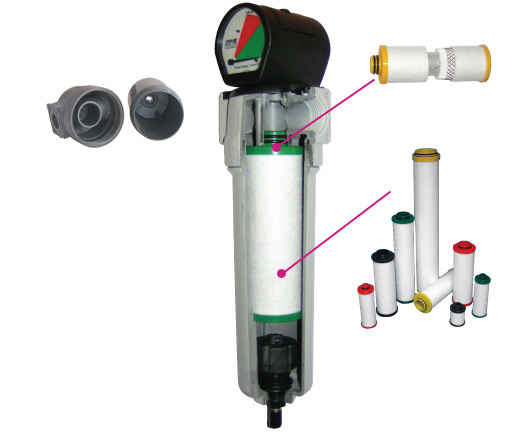 Corpo del filtro in alluminio anodizzato sia internamente che esternamente per prevenire la corrosione. Verniciato esternamente a polveri.